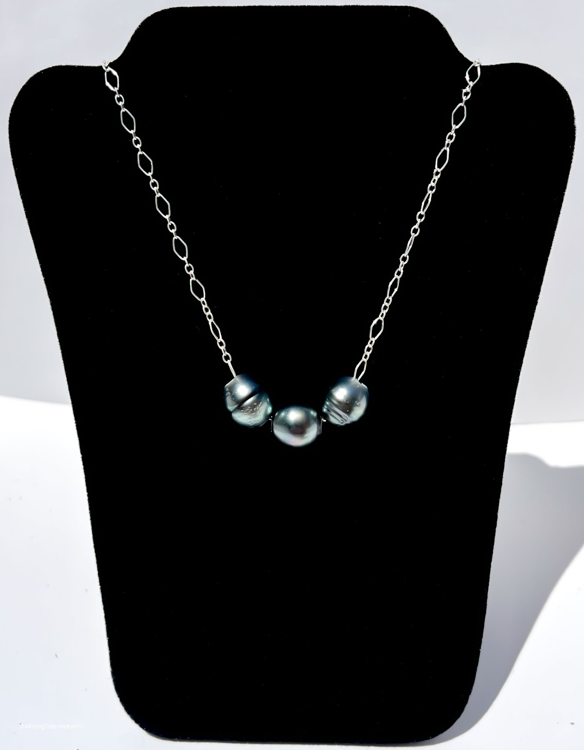 Adorn yourself with the timeless beauty of the Oceanic Opulence Necklace featuring three lustrous circle Tahitian pearls, adding sophistication to any ensemble